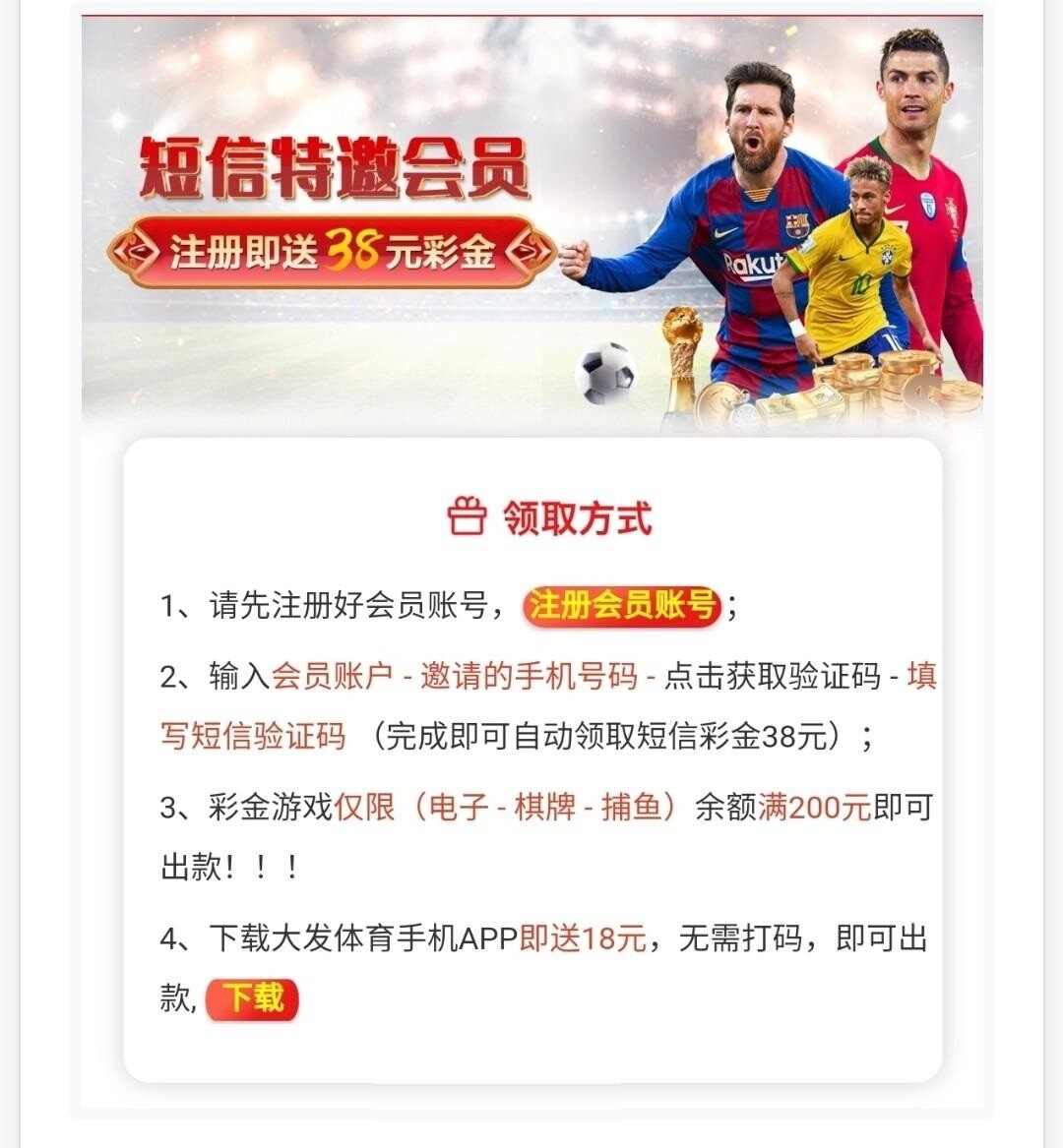 特邀碰瓷,可以先去链接里的自助领取彩金,输入手机号获取验证码,看看能不能收到验证码,能收到说明可以领之后在再注册领取38,收不到无视即可。禁止充值,白嫖就好