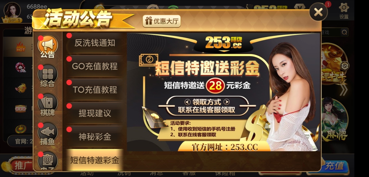 新用户注册完善资料,联系客服申请特邀彩金28,直接发手机号还有ID过去,不用短信。但是查特邀名单,反正我没有收到短信也送了。就算不送也没关系多注册这种平台特邀短信才多。