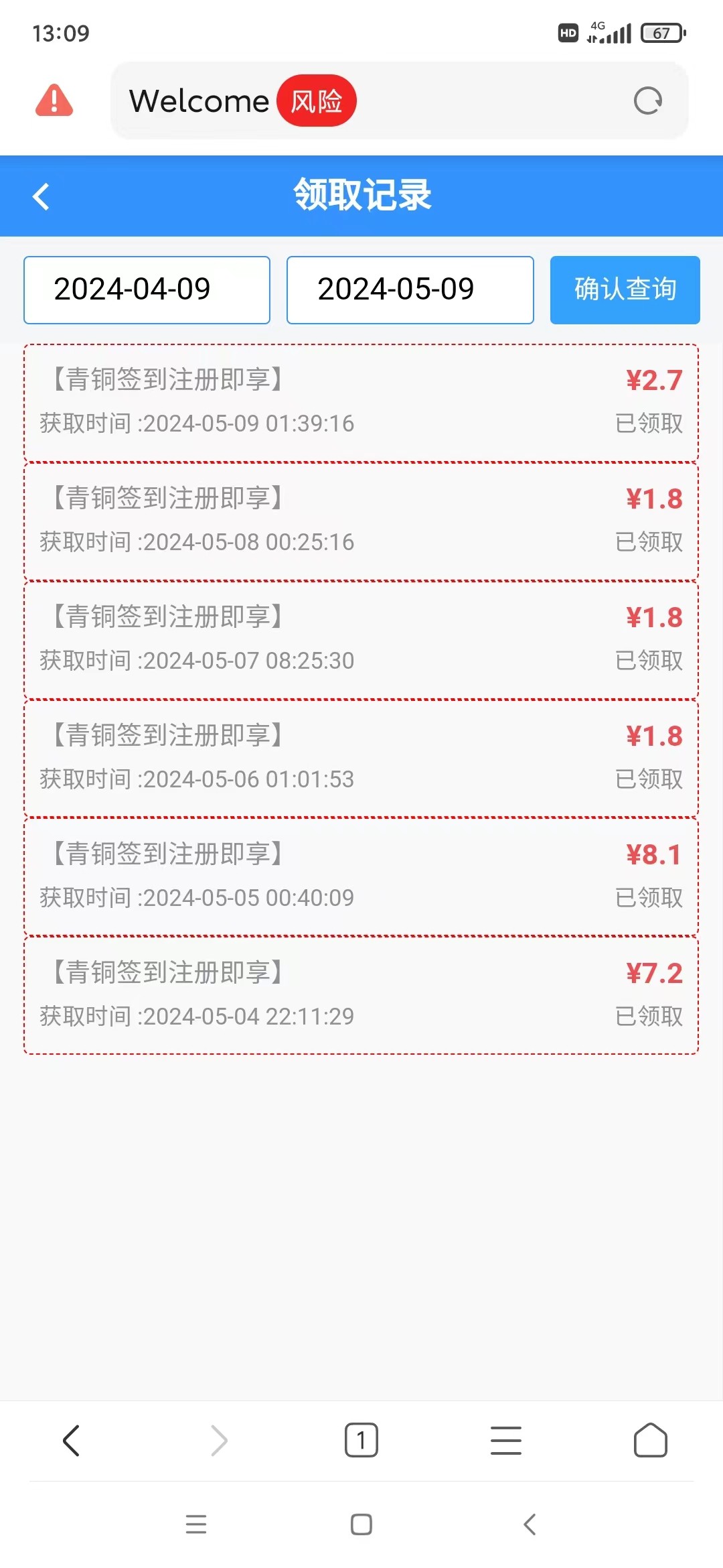注册绑卡,手机号,主页右上角每天可以签到一次,每次最低8.1元