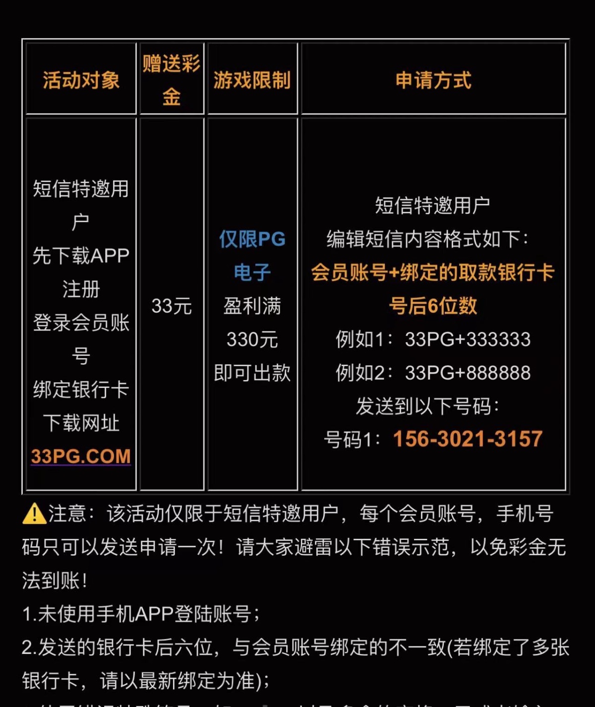 前几天注册没送的昨天今天收到短信都可以去申请试试先下载app,再注册绑卡,根据要求发短信秒到33,只能玩pg,330提,注意一定要下载app再注册绑卡,顺序不要错了,具体自测切记勿充值。可能是特邀才送吧,具体自测没送无视吧