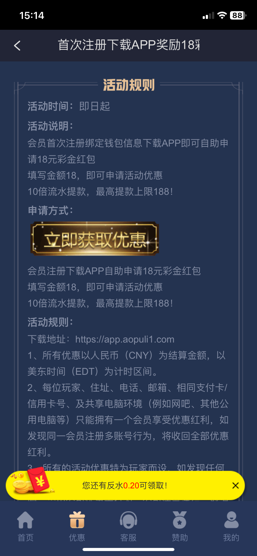 注册并下载app,优惠里点击新人见面礼申请,18彩金10倍流水,提现上限最高提188