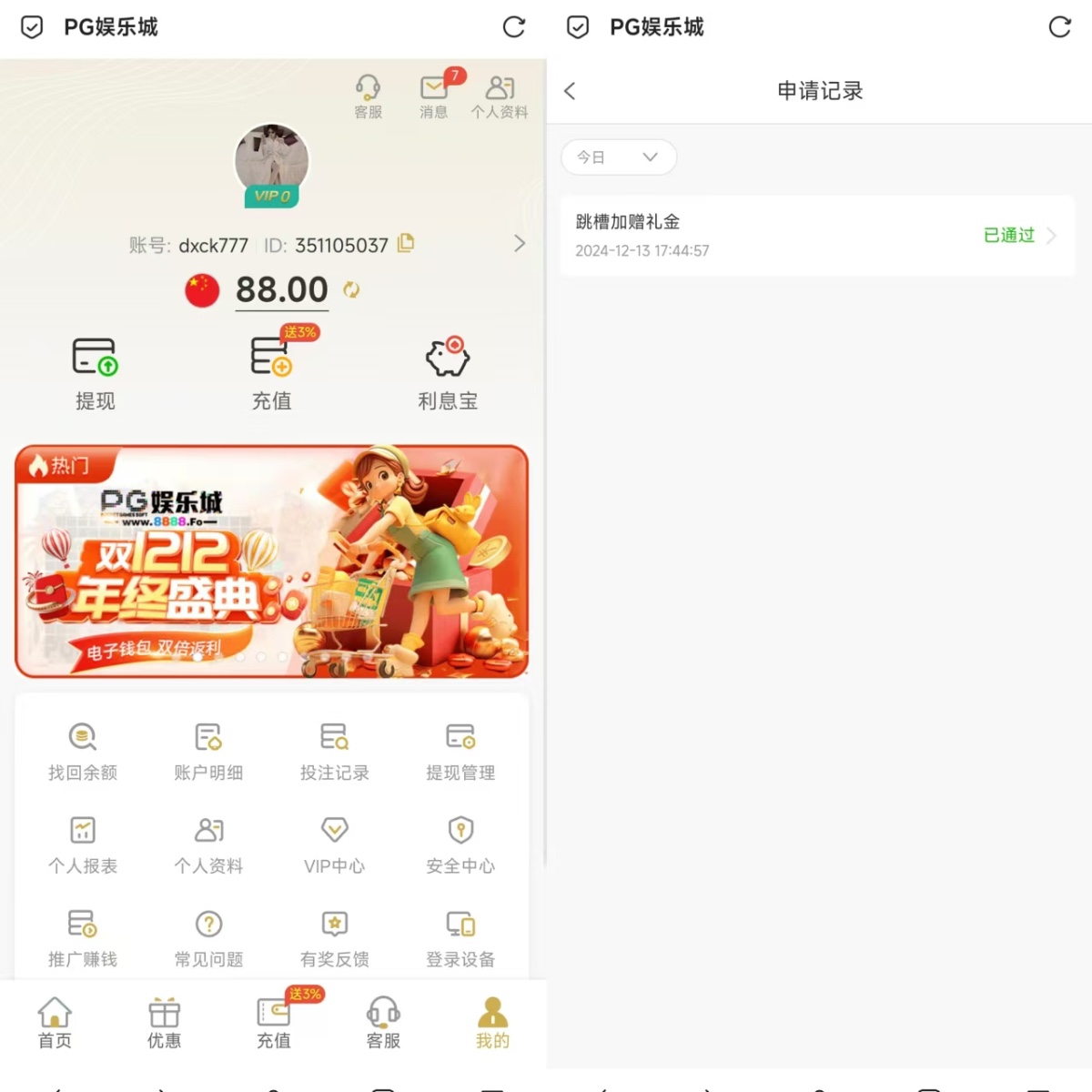 项目规则: 其他平台VIP等级大于等于2,进入一下网站注册后优惠大厅自助申请8-588彩金。亲测88元。一倍流水提现。