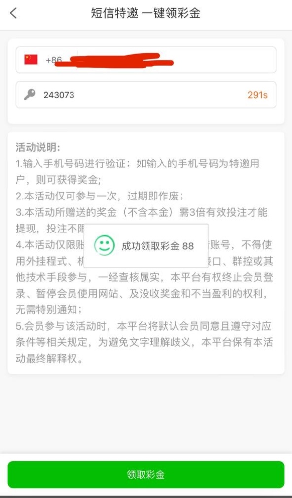 新用户注册验证手机号是特邀秒88彩金,不是特邀没有88彩金,具体规则自测吧