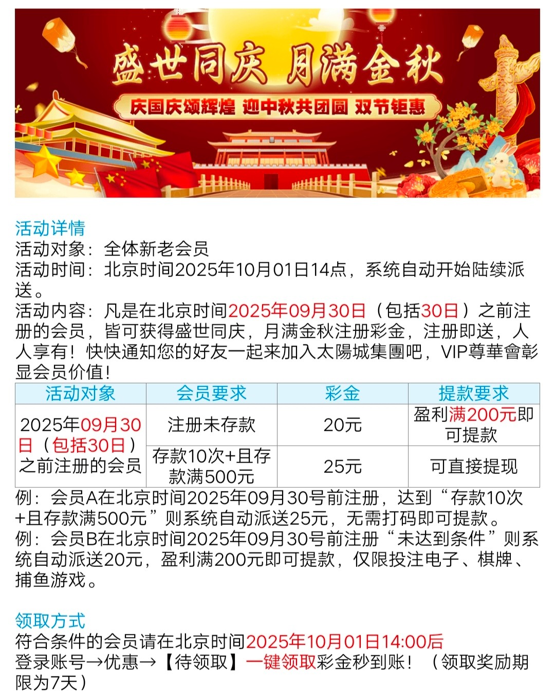 本站声明 1、本帖标题:【太阳城】—✅—双节彩金/包赔/兑换码彩金