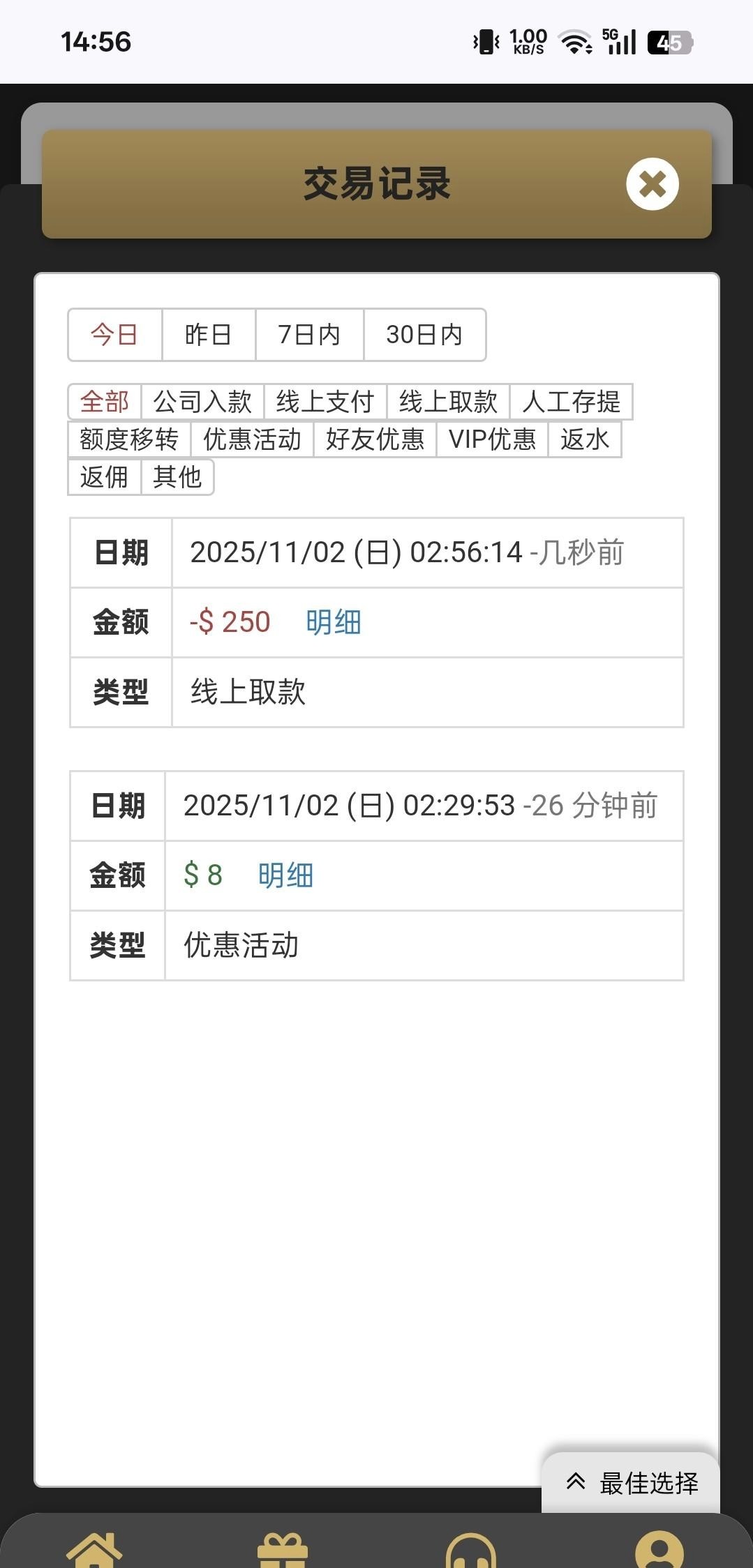 老会员登录上线看看送的8元回馈,水挺大,拉2次就来免费了,链接913.am