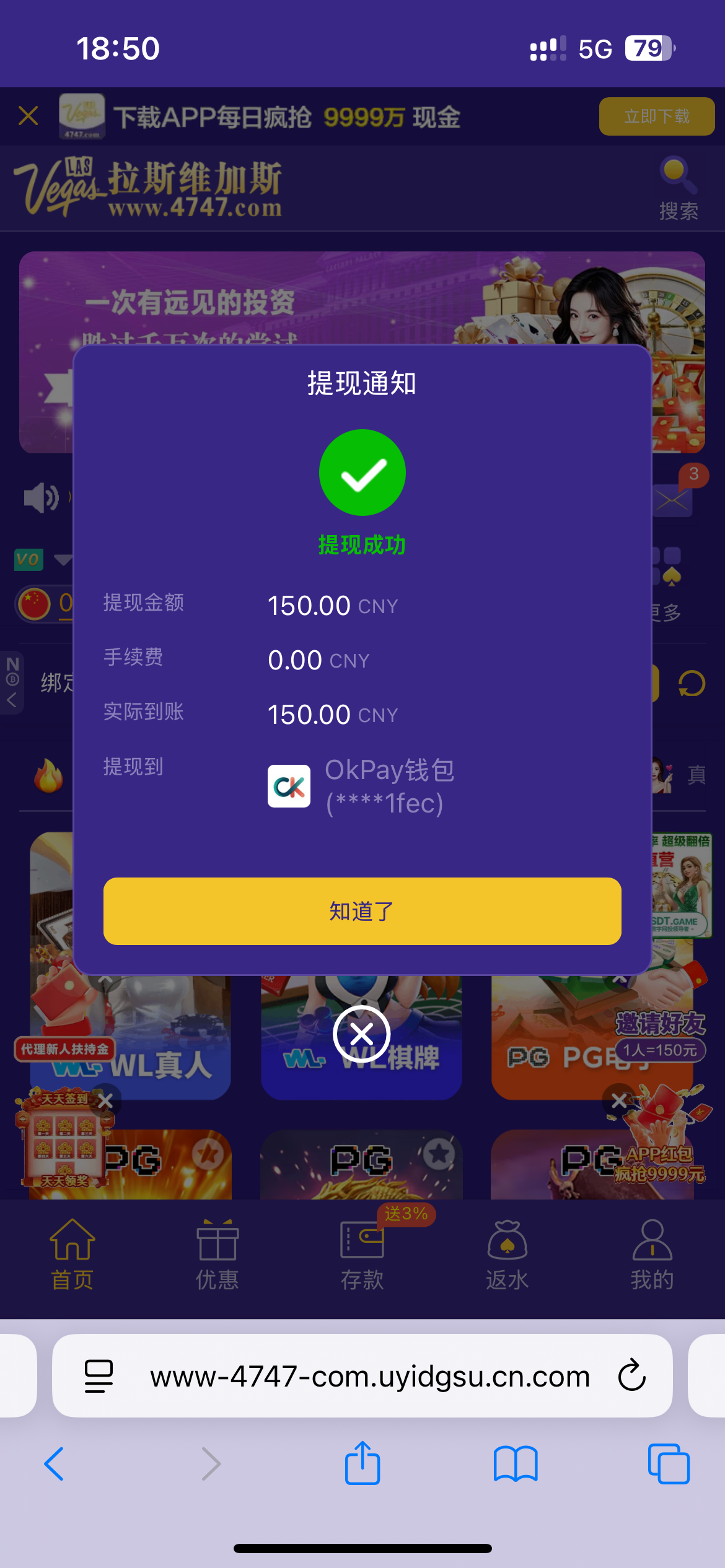 拉斯维加斯特邀彩金18没打出来 充了三十出150。www.4747.com
