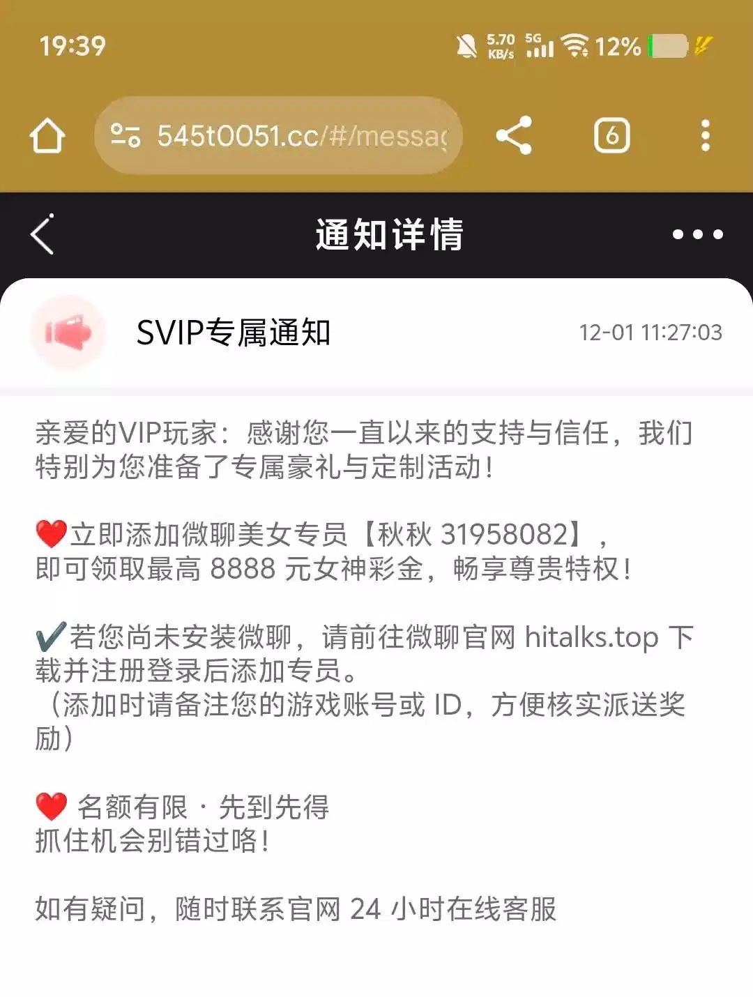 我是前段时间充值过老号 今天收到了站内信 联系聊天室客服送了18彩金 545.cc