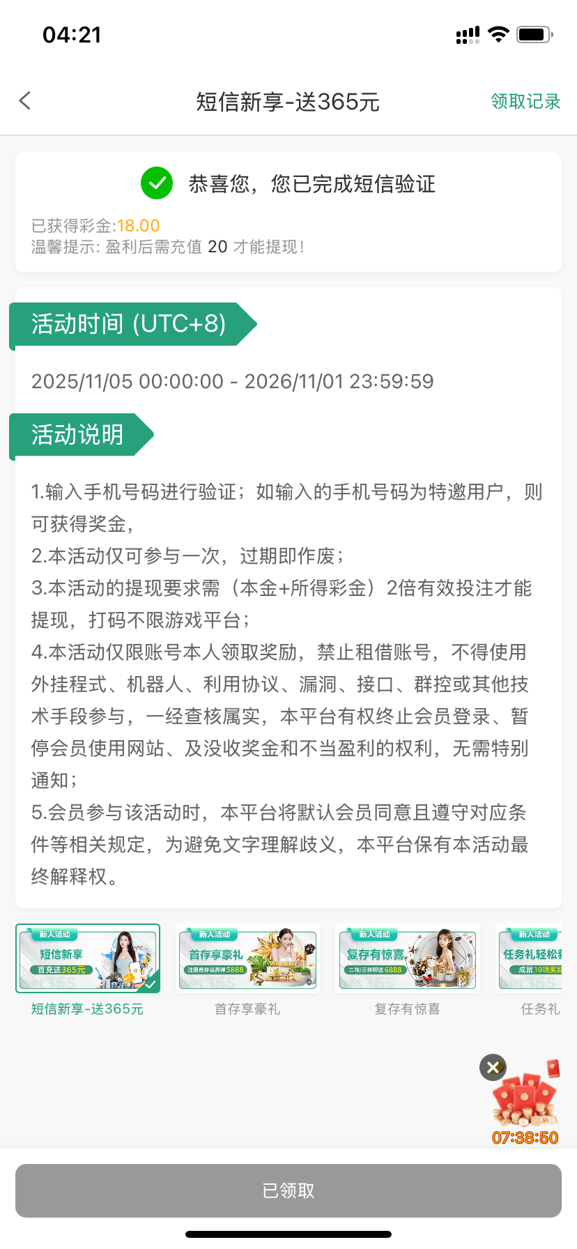 网址 65.gg 短信验证彩金 用常用的号码试试吧