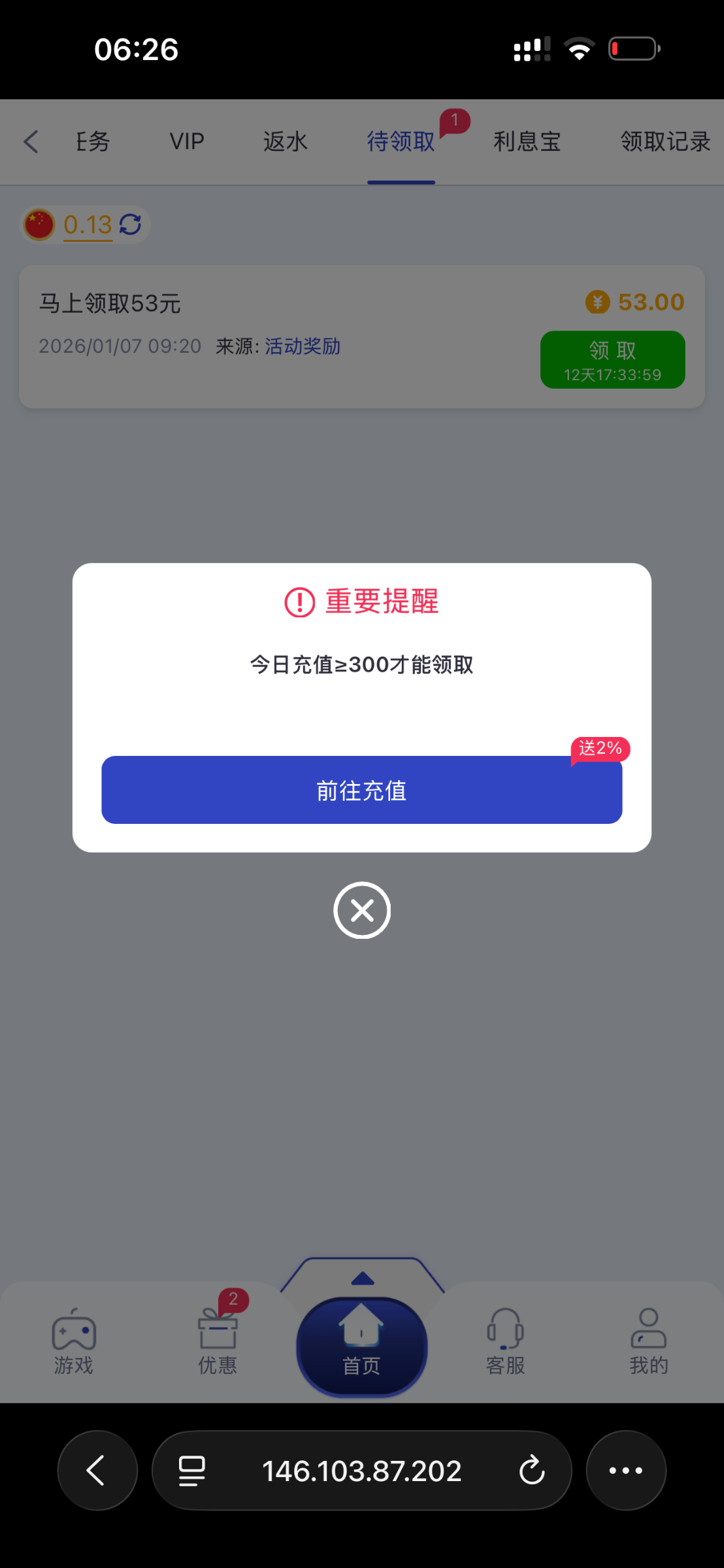 泥马当天要充值300才能领取