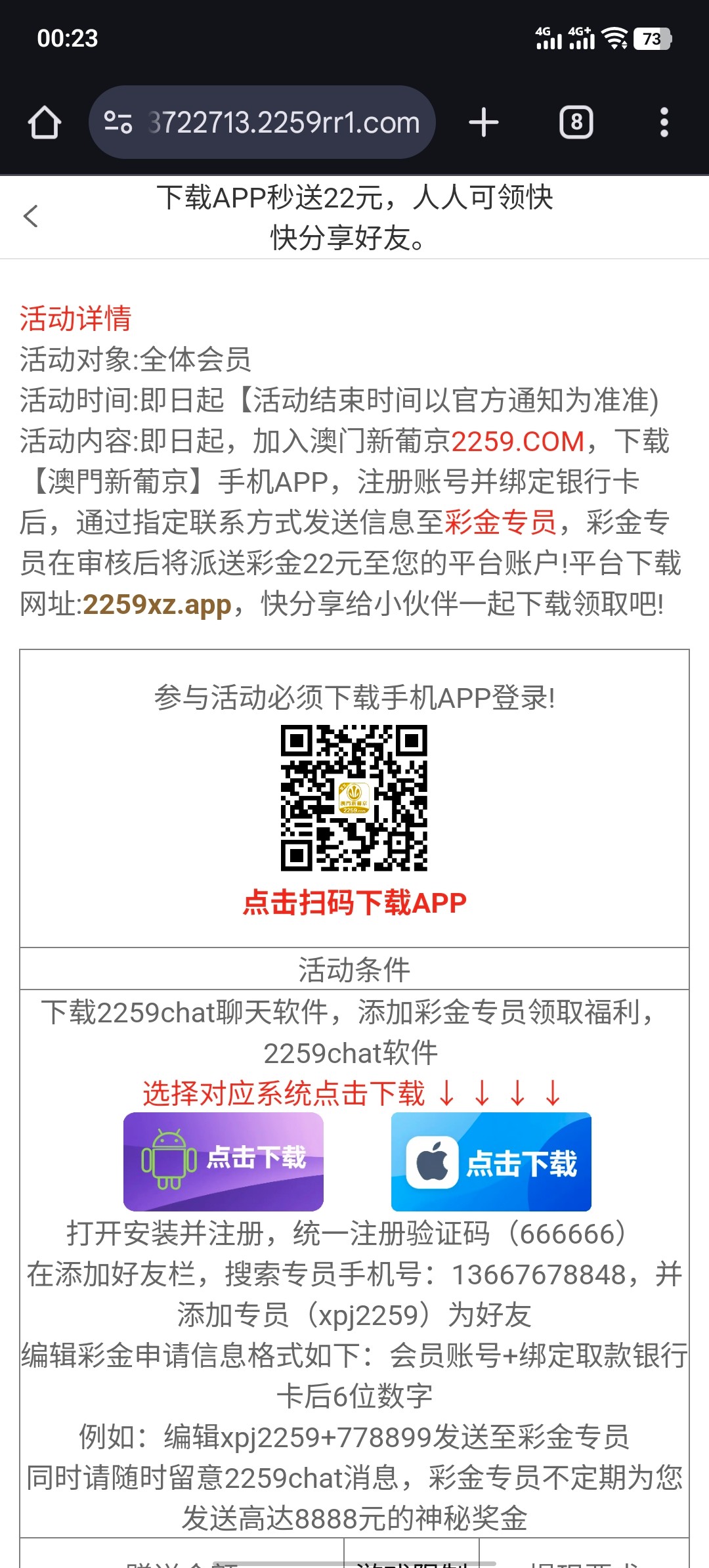 注册送22新老用户都可以参加,下载app注册完善资料再下2259chat跟客服发账号加银行卡后6位领22彩金,只能打wg电子