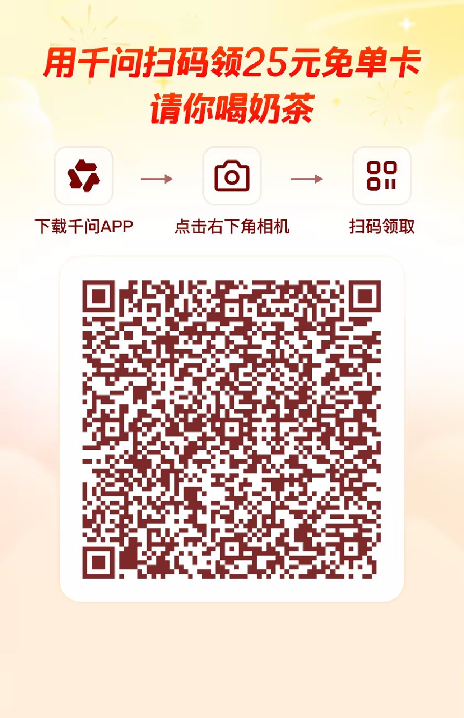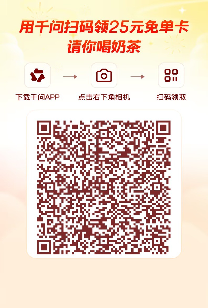 下载个 千问,输入 给我点个外卖,它会自动弹出来商家,然后自己选,最后结账的时候旁边有个使用千问免单卡,25以内的免单,可以点个汉堡奶茶蛋炒饭啥的!