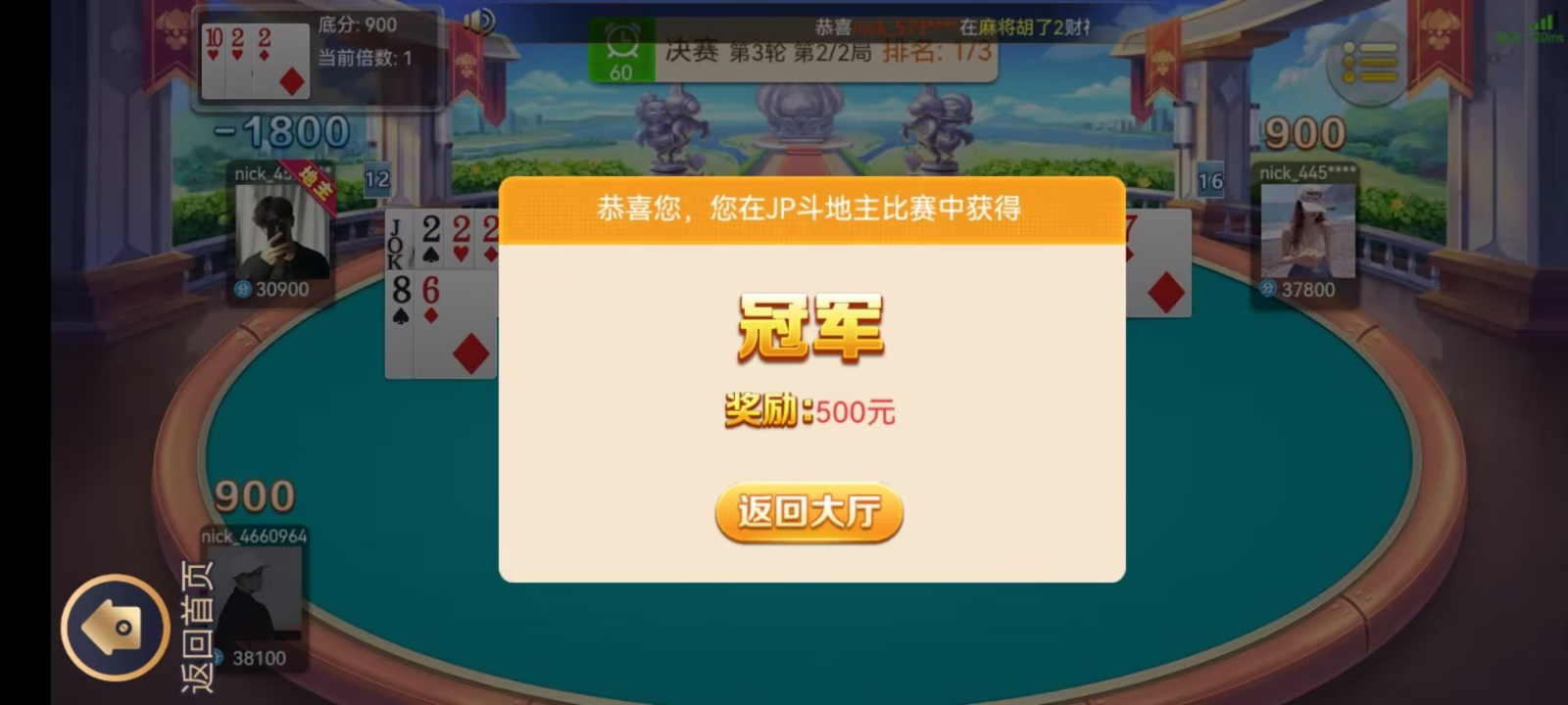 新老用户每天jp斗地主比赛三场,15/21/22点,第一名送500其余名次奖励看活动