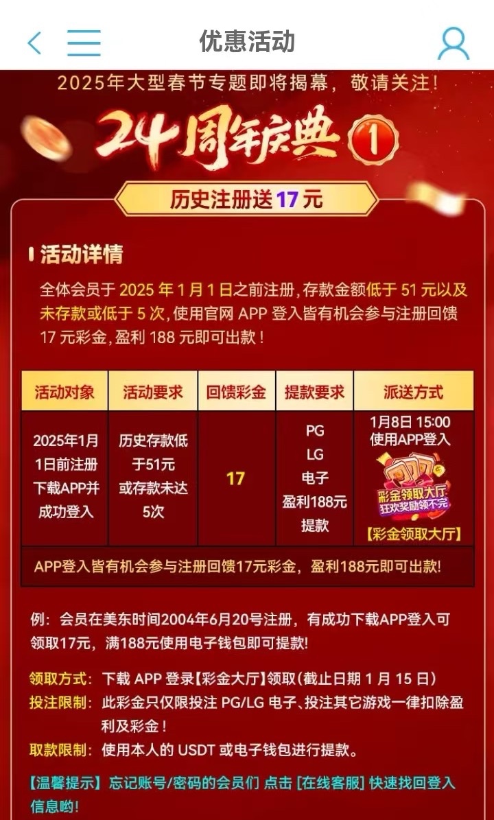 项目规则: 1,1号前注册的1.8号下午三点彩金大厅自助领取17元,历史存款有过51元且5次以上多回馈17元。